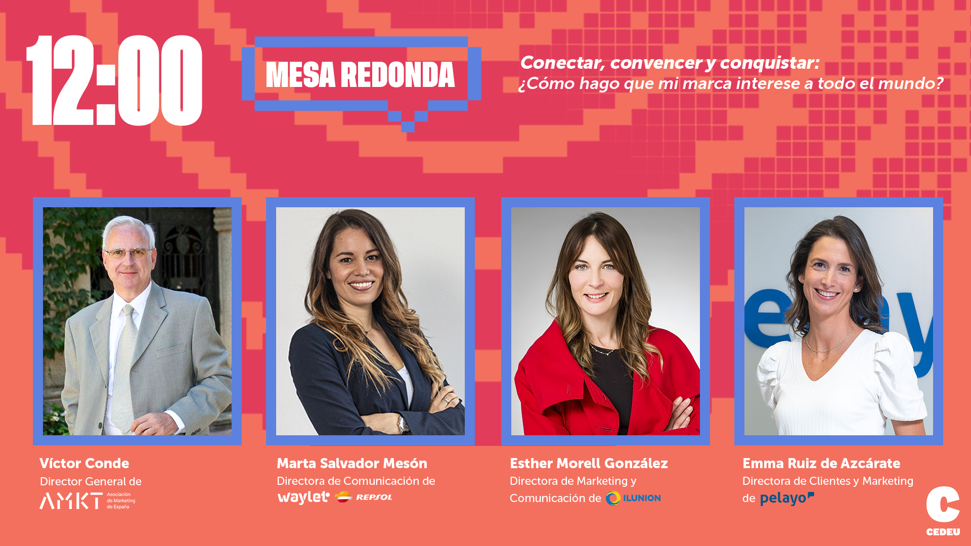Además en la primera mesa redonda titulada "Conectar, convencer y conquistar: ¿Cómo hago que mi marca interese a todo el mundo?", moderada por Víctor Conde, el director general de la Asociación de Marketing de España. Participaron Marta Salvador Mesón, directora de comunicación de Waylet de Repsol; Esther Morell González, directora de marketing y comunicación de Ilunion; y Emma Ruiz de Azcárate, directora de clientes y marketing de Pelayo Seguros, quienes ofrecieron valiosas ideas sobre cómo construir marcas atractivas y sostenibles en un mercado cada vez más competitivo.